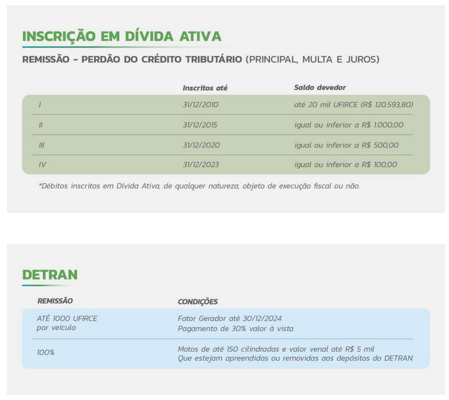 As dívidas contempladas são do Imposto sobre Circulação de Mercadorias e Serviços (ICMS), do Imposto sobre Propriedade de Veículos Automotores (IPVA), do Imposto sobre Transmissão Causa Mortis e Doação (ITCD) e de taxas do Departamento Estadual de Trânsito do Estado do Ceará (Detran).
